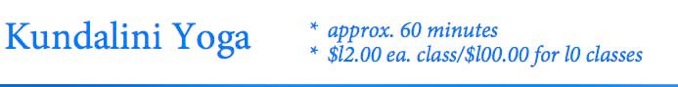 Kundalini Yoga is an impactful one hour class beginning with a series of powerful breathing exercises. This awakens the body - stimulating ones energy by deeply inhaling oxygen - (lifeforce energy) - and exhaling carbon dioxide, (toxins) on the out breath.